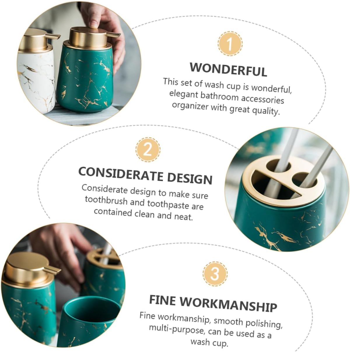Package List 2 x cups 1 x soap tray 1 x Lotion bottle Features - Material: ceramic Washing Cup Kit. - Size: 11.40X11.40X2.00cm/4.48X4.48X0.79in Toothbrush Cup. - Can be used for toothbrush and toothpaste storage Soap Tray. - marble printing, high-end material and appearance Bathroom Washing Supply. - It includes toothbrush cup, mouthwash cup, soap dish, lotion bottle Washing Cup. - The unique design makes the toothbrush storage containers perfect for family, school and also an ideal for Soap Dish. - Keep your toothbrush and toothpaste tidy with this cup Toothpaste Cup.Goods InformationWashing Cup Kit This is a set of premium toothbrush or a toothpaste holder box.Soap Dish Are you looking for a toothbrush case? The item will be a .Washing Cup Due to its pretty appearance, it is wonderful for home decoration.Soap Tray It helps you keep your toothbrushes and toothpaste clean and tidy