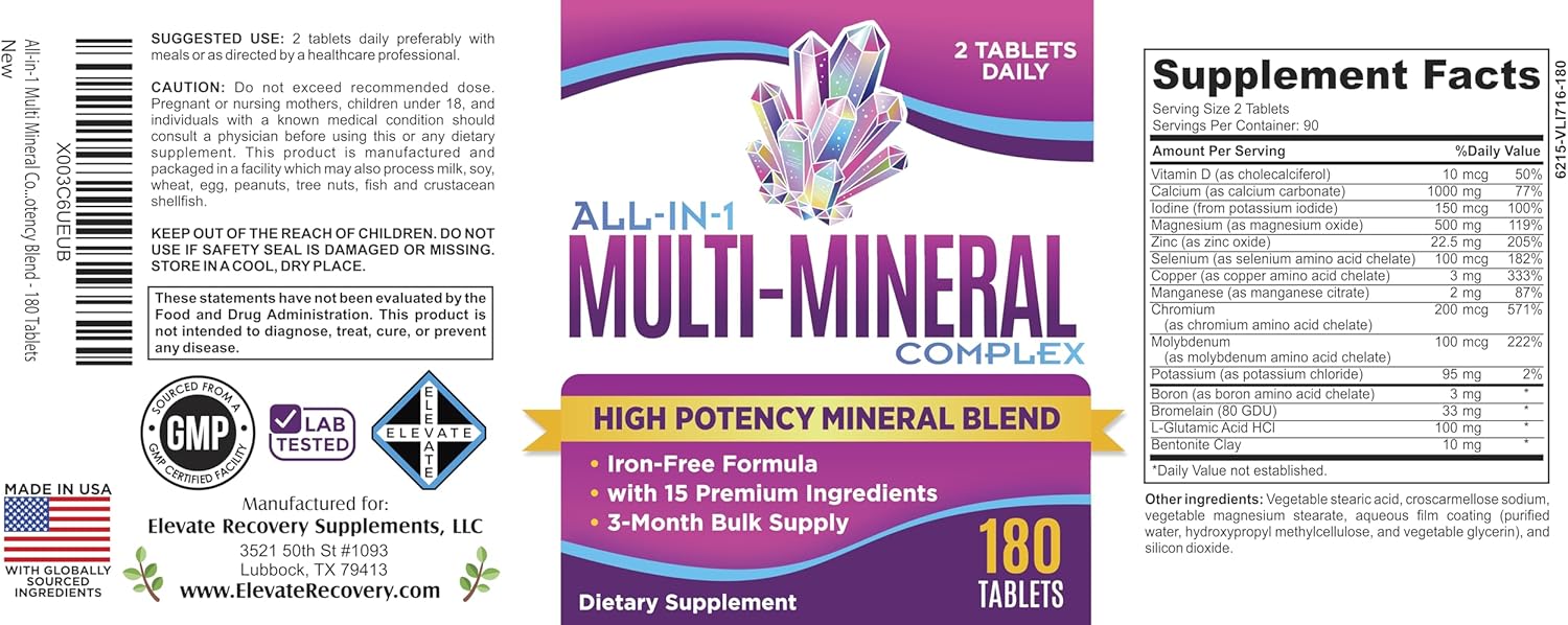 15-in-1 Multimineral Supplement | 180 Tablets Iron-Free Mineral Formula Strategically formulated with: Vitamin D, Calcium, Iodine, Magnesium, Zinc, Selenium, Copper, Manganese, Chromium, Molybdenum, Potassium, Boron, Bromelain, L-Glutamic Acid HCl, and Bentonite Clay | Multi Minerals 3-Month Supply Bottle Made in the USA + 3rd party lab tested | Our supplement products arrive fast, fresh, and safety-sealed — with an average of 12–18 months remaining before the expiration date printed on the bottom of each bottle.