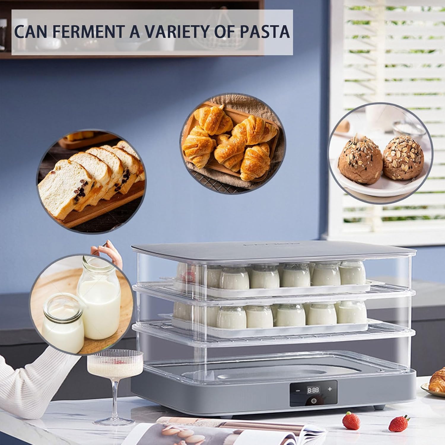 Our Bread Fermentation Box Supports Time/Temperature Adjustment, And The Fermentation Process Can Be Set As Needed. It Adopts A Stackable Design And Can Be Combined. The Detachable Design Is Easy To Clean And Store. It Also Has A Food Insulation Function. It Is A Fermentation Box That Can Meet Your Various Daily Needs.-Product Advantages:1. The Transparent Fermentation Tray Allows You To Observe The Food Ingredients From All Directions.2. The Detachable Design Allows For Quick Stacking And Combination.3. The Non-Slip Bottom Corner Design Allows For Stable Placement.Product Specifications:Product Name: Home Fermentation BoxProduct Power: 130wCapacity: About 40lTemperature Range: 20-45°C AdjustableTime: 1min-24h AdjustableWeight: 6.6 KgProduct Size: About 489*364*328mmOuter Box Size: About 540*422*400mm-Packing List:1 * Insulation Cover1 * Base3 * Fermentation Tray2 * Grid1 * Lid-Warm Tips:1. Before Purchasing, Please Confirm The Size Shown In The Description. Due To Manual Measurement, Please Allow 1-2 Cm Error.2. Due To The Difference In Light And Screen, The Color Of The Product May Be Slightly Different From Your Screen.3. In American Countries, It Can Only Be Used After The Transformer Is Connected. (The Package Contains The Transformer); In European Countries, It Can Only Be Used With The Conversion Plug, (The Package Contains The Conversion Plug).4. If You Have Any Questions About Our Bread Proofing Box, Please Feel To Contact Us By Email. We Will Reply You Within 24 Hours And Are Honored To Provide You With Satisfactory Service.