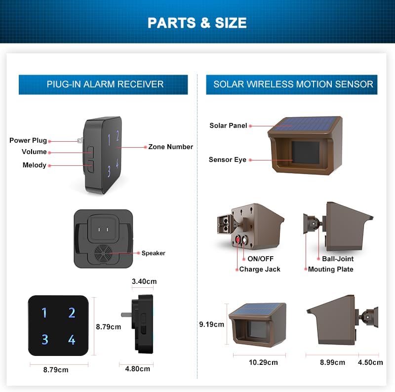 The solar motion sensor is powered by rechargeable battery and solar charged. No need replace battery of the sensor.--Detects motion in up to different zones. Alerts with light and sound.--Fully expandable system, up to 4 sensors can be added to the 1 receiver; and 1 sensor can be added to unlimited receivers. (Restart the receivers or sensors will not miss the records)