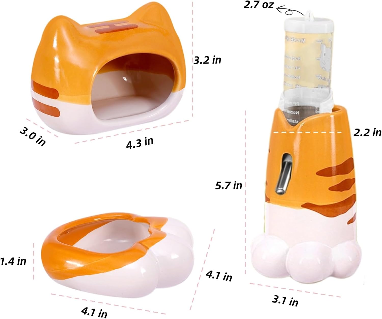 Bring style, durability, and comfort to your hamster's little world with our Ceramic Hamster Supplies 4PCS Set. Designed with both aesthetics and functionality in mind, this set includes everything your tiny companion needs to thrive — a cozy hideout, a sturdy food bowl, a charming water jug, and a water bottle. Crafted entirely from high-quality ceramic, each piece offers natural cooling properties, keeping your hamster comfortable during hot summer days. In colder months, simply add bedding or a safe heating pad inside the hideout for added warmth. The smooth ceramic surfaces are easy to clean and resistant to odors, ensuring a fresh and hygienic environment for your pet. The cute animal paw design adds a playful touch to any cage, transforming your hamster's home into a mini wonderland. Watching your little buddy explore the hideout or nibble around the bowl becomes a daily source of joy and relaxation for you too. Whether you're setting up a new cage or upgrading your current setup, this complete ceramic set is the perfect choice for caring hamster owners who want the best for their small pets. What's included:1 x Ceramic Hamster Hideout (Small or Medium)1 x Ceramic Food Bowl1 x Ceramic Waterbottle Stand1 x Water Bottles (Small or Medium) Upgrade your hamster's life today with our adorable and functional Ceramic Hamster Supplies Set — where cuteness meets care.