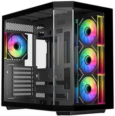 DIYPC ARGBN3-BK is a panoramic E-ATX /ATX case w/3 tempered glass with a 270° full view of your masterpiece for building high-performance system. It has front and side tempered glass panel, w/top mesh design allow optimized air flow. The case’s design has bigger interior space to accommodate and improve cooling performance (can support up to 420mm x GPU and 360mm radiator x top/MB side). It supports up to 200mm long full ATX power supply to run the most power hungry system. Advanced cable management design – routing the main cable is easy and quick through a hidden channel. There is a large space behind the motherboard for all cables, making the case a clean and beautiful look. 2 ways to control ARGB Fan Lighting: Either by Manual ARGB LED Button on Top I/O Panel; or if your motherboard has 5v addressable connector, this case has ARGB 5V/3 pin header ready to SYNC w/your motherboard to control ARGB lighting. ARGB HUB controller with PWM is included. Water cooling ready – MB side /Top support up to 360mm, rear support 1 x 120mm radiator Advanced bottom-mounted power supply design Top mounted IO ports - 2 x USB 3.0 / 1 x Type C for up-to-date high speed data transfer 10 fans capability (3 x 120mm ARGB reverse blade PWM fan x MB side, 1 x 120mm ARGB PWM fan x rear pre-installed) provide great cooling and gaming performance Magnetic dust filter at top - easy clean Support up to 155mm CPU cooler Support up to 420mm VGA card