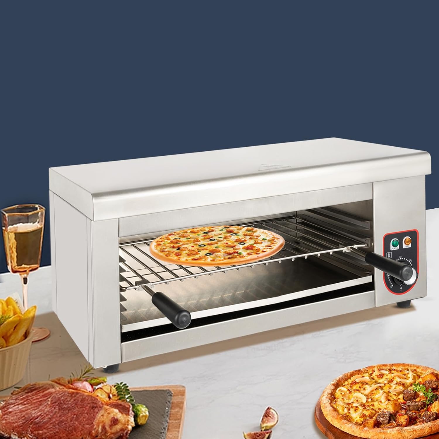 DescriptionIf you want to enrich the variety of food in your daily life, then use our high-performance cheese melter to make delicious cheeseburgers or cheese sandwiches for you and your family. It uses advanced electric heating technology that not only heats up quickly but also provides precise temperature control, making it ideal for home cooking and catering. The adjustable tier height and wide temperature adjustment range are suitable for multiple food types. As a revolutionary cooking appliance for modern kitchens, it redefines the cooking experience with its efficiency, cleanliness and convenience.ApplicationIt is ideal for melting cheese, toasting sandwiches/burgers, and grilling steaks, fish, chicken wings, and other meats, at home, in hotels, restaurants, etc. SpecificationColor: SilverMaterial: Stainless Steel, RubberProcess: Polished, Brushed Mounting Type: Wall Mounted, Freestanding Power Source: ElectricPlug: US StandardVoltage: 110V/60HzPower: 1500WTemperature Range: 50-300°C/122-572°FGrill Adjustable Position: 4 LevelsMax. Single Working Time: 12H Power Cord Length: 1.35m/4.43ft Grill Mesh Size: 45*24.5cm/17.72*9.65in Oil Tray Size: 45*26cm/17.72*10.24in Product Size: 61*30*28cm/24*11.81*11.02in Package Size: 68*34.5*39cm/26.77*13.58*15.35in Gross Weight: 13.55kg/29.87lbsNet Weight: 11.6kg/25.57lbsPackage Included1x Cheese Melter1x Pair of Gloves1x Clip1x Oil Tray1x Grill2x Handles1x Power Cord1x English Manual