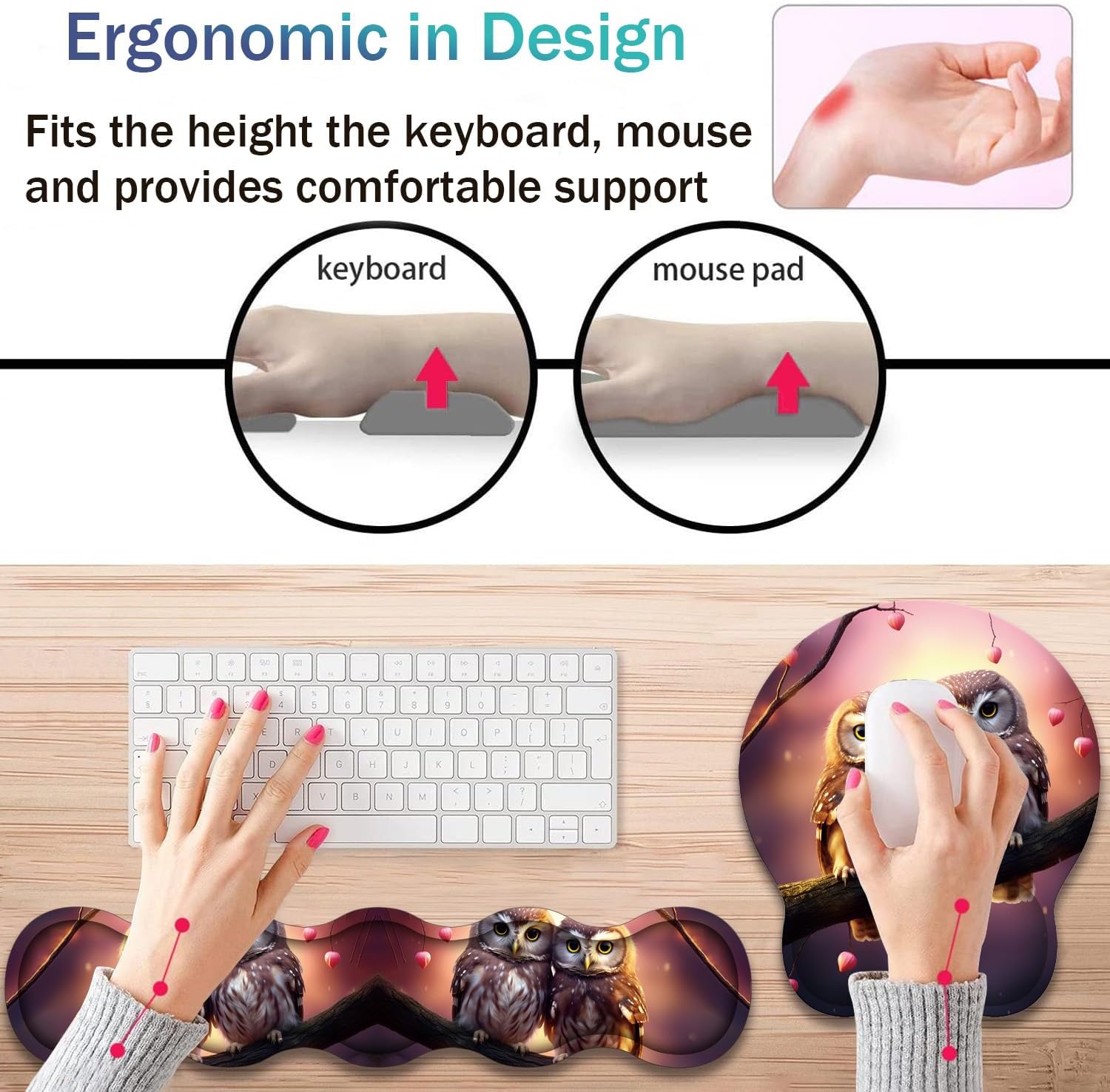 Ergonomic Mouse Pad with Wrist Rest + Keyboard Wrist Rest + Coaster Set, a great gift for work or playing computer games.Soft wrist rest is designed to fit the wrist perfectly, reducing the pressure on the wrist and helping to avoid joint and wrist problems.Feature:-- Protect wrist joints and reduce wrist fatigue and pain caused by prolonged use of keyboard and mouse.-- Natural rubber material and Lycra super smooth surface, make your mouse movement more accurate.-- The non-slip PU rubber sole firmly grips the desktop, not easy to move, so you can use it with confidence.-- Keyboard wrist rest support and wrist rest mouse pad have reinforced edges to prevent deformation or damage and have a long service life.-- The product comes with beautiful illustrations to ensure no fading or bleeding. An ideal gift for family, friends, colleagues and more.Product Specifications:Material: Comfort Gel, Non-Slip PU Base and LycraWrist Padding Material: Memory FormProduct Dimensions: Keyboard Wrist Rest (17.35 x 3.55 x 0.98 inches); Mouse Pad Wrist Rest (9.84 x 8.66 x 0.98 inches); Coaster (3.93 x 3.93 inches)Package Included:1 × Mouse Pad Wrist Rest;1 × Keyboard Wrist Rest;1 × CoasterService:Order an ergonomic keyboard and mouse wrist pad now to say goodbye to uncomfortable and painful typing. If you have any questions or concerns about the product, please contact us, we are ready to help you.