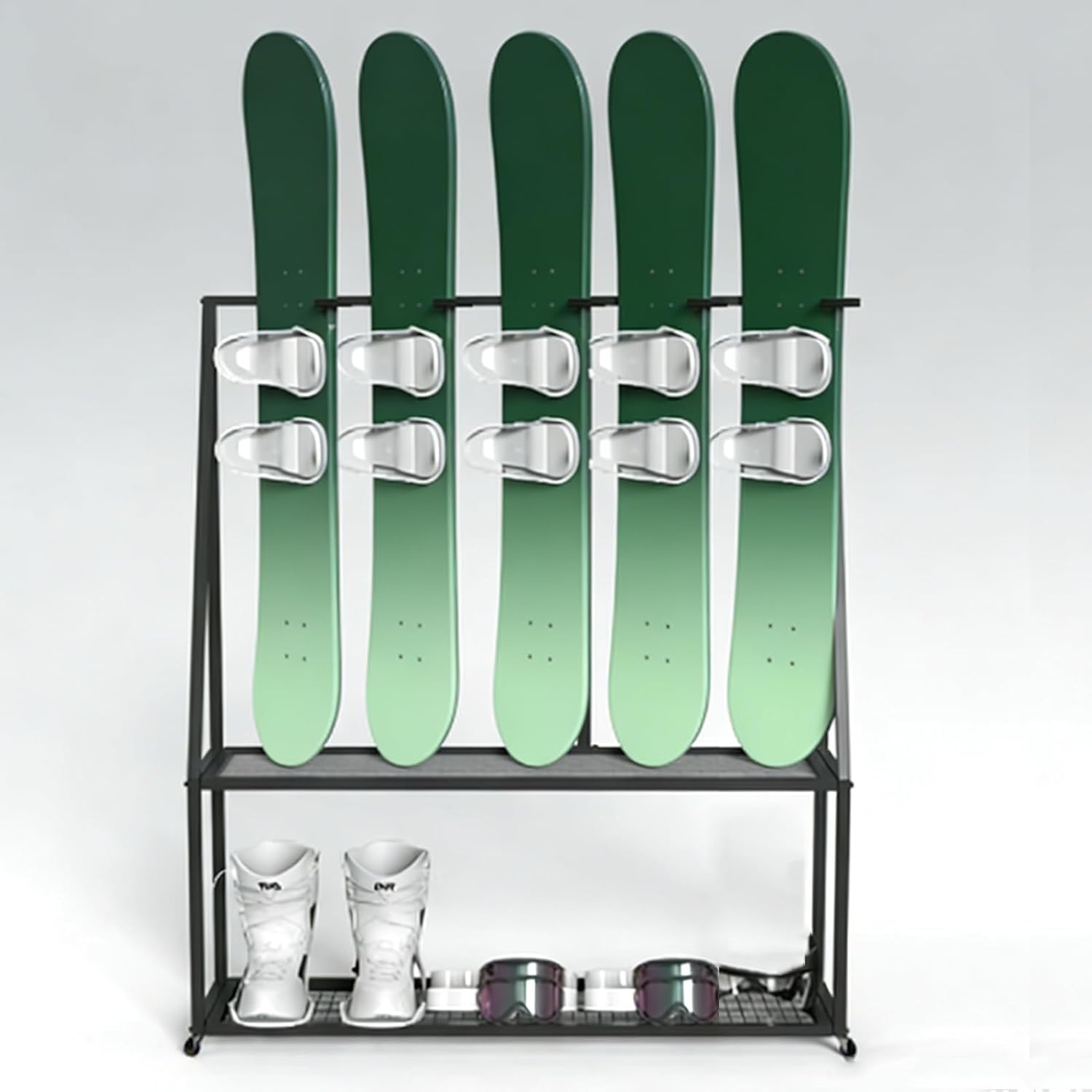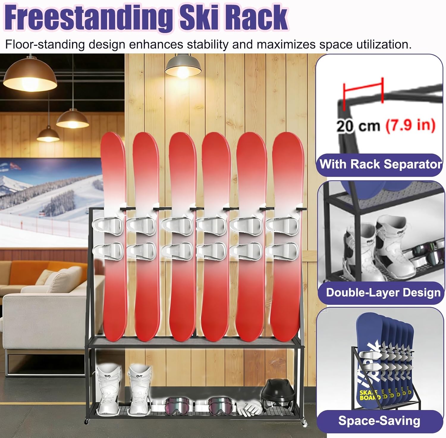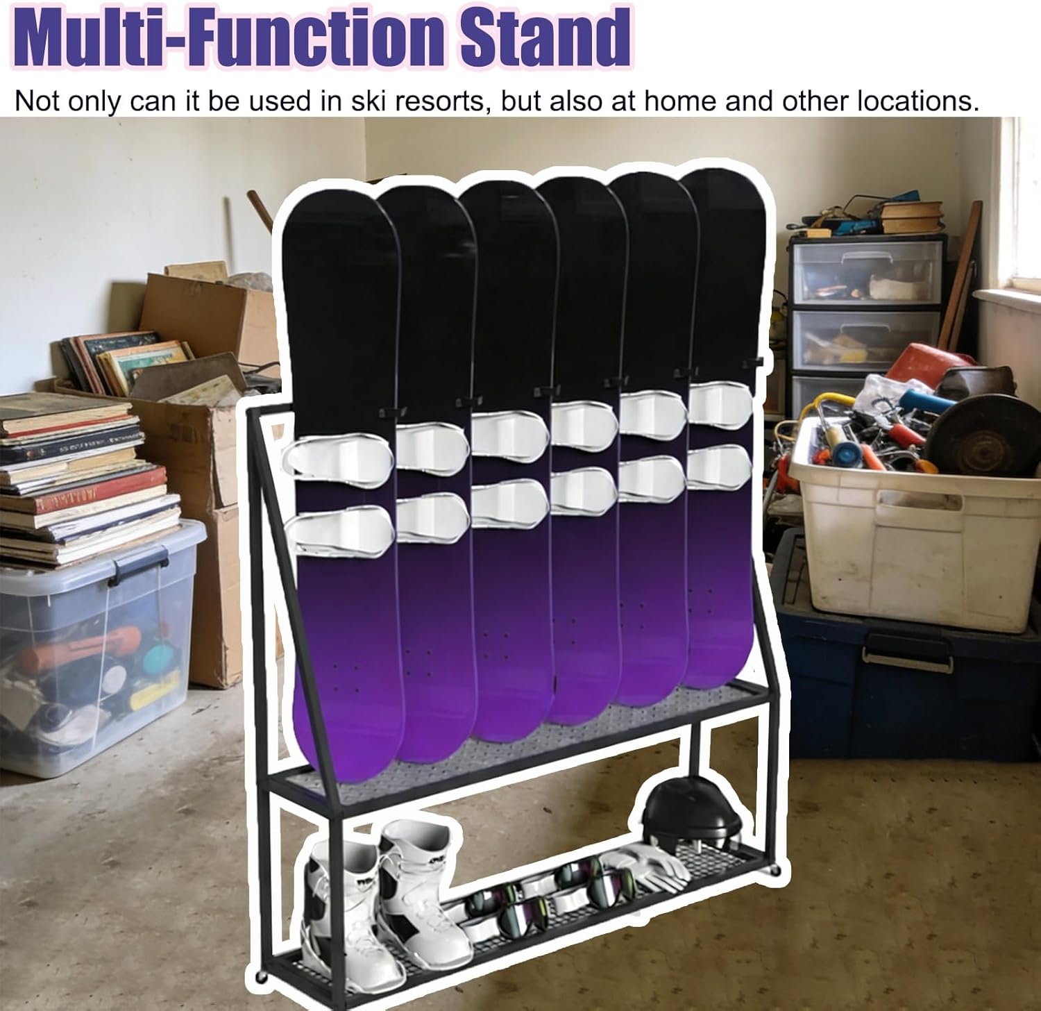 Have you ever had your snowboard leaning against the wall tip over and nearly hit your feet?Have you ever had your snowboards stacked haphazardly with poles scattered everywhere?Choose our snowboard rack—it's not only the ideal storage solution for winter sports enthusiasts but also a practical gift for skiing lovers.❉Package Include:- Ski Rack x 1(Excluding skis)❉Specifications:- Material: Iron- Surface: Varnished- Rack Height: 130 cm (51.2 in)- Rack Depth: 40 cm (15.7 in)- Rack Width: 120 cm (47.2 in) / 140 cm (55.1 in)- Wall Thickness: 2 mm (0.08 in)- Separation Slot Width: 20 cm (7.9 in)- Features: Lockable wheels & Double-layer- Size Available: (Snowboard) Holds 5 pcs / Holds 6 pcs-It can be used to store helmets, goggles, ski poles, ski boots, etc.❉Applicable Scenarios:- Features an iron mesh bottom for ventilation.- Features lockable wheels for easy transport.- Can be given as a gift for skiing enthusiasts.- Vertical floor-standing design saves wall space.- Slots with separators to prevent skis from bumping into each other.- Precision welding with thickened materials ensures long-lasting durability.❉Note:- If the goods you received are damaged or missing parts, please contact us by email and we will resend them to you in time.- There may be some 1-2 cm errors in manual measurement, please refer to the actual product.- Colors might slightly vary due to the shoot lights and on different monitors and screens, please refer to the objects received.