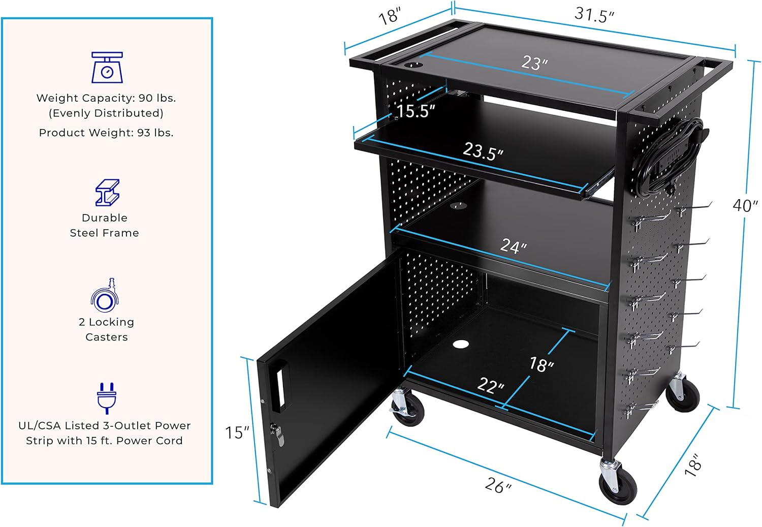 | Included Components | Steel pegboard frame, 12 attachable peg hooks, locking cabinet, pullout keyboard tray, spacious shelves with retaining lips, UL safety-certified power strip with surge protection, and optionally cabinets, drop leaf shelving, and keyboard tray |