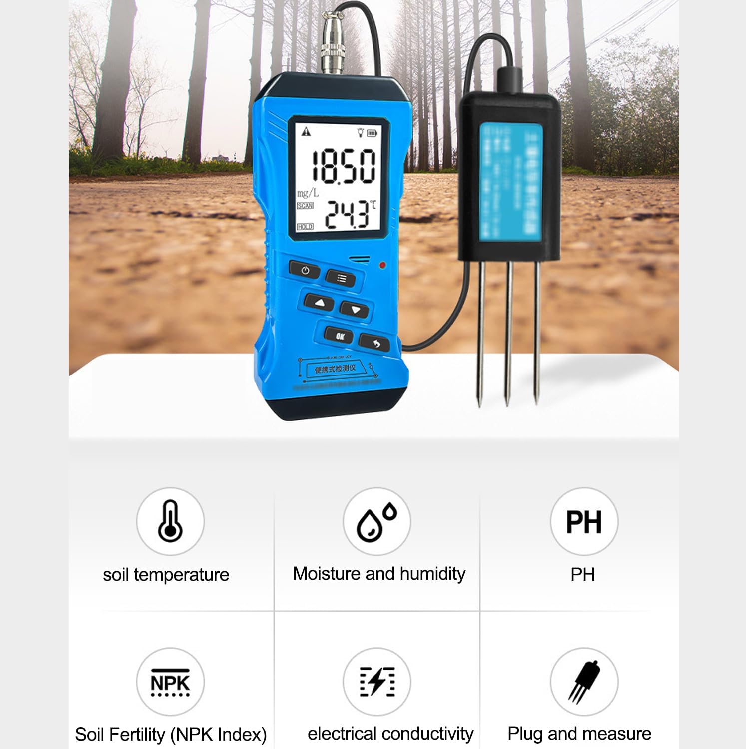 - The detector uses a digital tube backlit display to display real-time readings. It can still be read clearly in low light conditions. Specification Moisture measurement range: 0-100% Temperature accuracy: 0.5°C Temperature measurement range: -40°C-80°C Moisture accuracy: 0-53% (±3%)/53-100% (±5%) Installation method: All embedded or all probes are inserted into the medium to be tested Conductivity range: 0-10000us/cm Conductivity resolution: 10us/cm Nitrogen, phosphorus and potassium measurement range: 0-1999mg/kg Nitrogen, phosphorus and potassium measurement accuracy: 2% F.S Nitrogen, phosphorus and potassium resolution: 1mg/kg (mg/l) PH measurement accuracy: ±0.3pH PH measurement range: 3-9pH Working power supply: 3 AAA batteries (not included) Display method: 3-inch LCD display Response speed: 3s Working temperature: -20°C~50°C Working humidity: <90% (relative humidity) no condensation Platform size: 170*93*29mm Weight: 260g Package Content:1 X Soil sensor