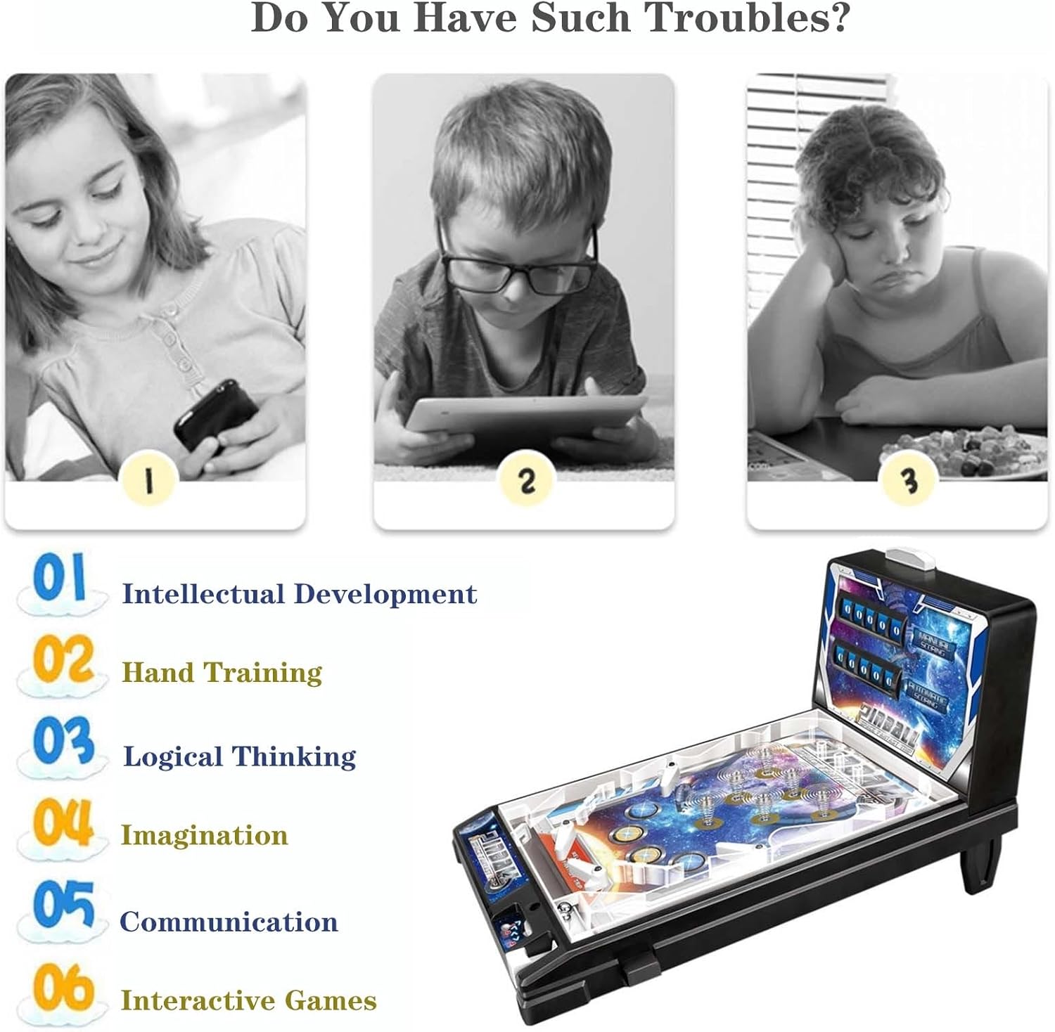 ✤ Welcome to our store!✤ This new type of casual desktop interactive game can enhance feelings, not only move the body, but also move the eyes, which can relax the visual nerves and reduce the chance of children's myopia.✤ Product Parameters✤ Product Name: Children's Pinball Machine✤ Material: Plastic✤ Product Weight: 1600g✤ Package Weight: About 2100g✤ Applicable Age: 4+✤ Product Size: 42x27x24.5cm / 16.5×10.6×9.6in✤ Packing: Pinball Machine × 1 (without battery)✤ Tips:1. Our product is recommended for use: Above 12 years old.2. Please forgive the colour difference due to lighting effect and shooting angle.3. During use, please don't shake it violently (Only when you hit the target, the music will sound, the light will light up).