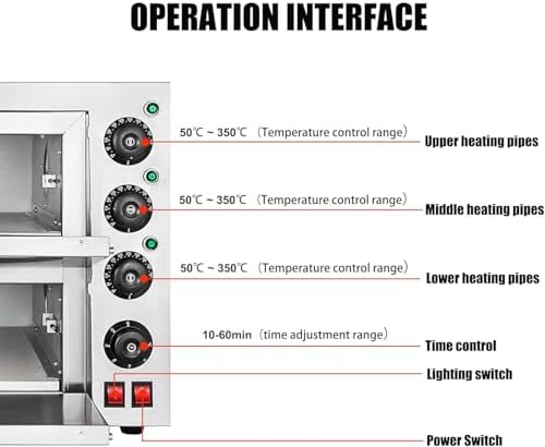 This electric pizza oven is designed for commercial use, featuring a double stainless steel toaster that allows for quick cooking of pizza, bread, chicken, and more. Key features include: a double temperature control knob for independent adjustment of upper and lower settings, a timing range of 0-60 minutes to accommodate various cooking needs, upper and lower heating tubes for uniform heating, a visual observation window for monitoring cooking status, and an easy-to-clean stainless steel construction.Specifications:Name: Commercial pizza drawer toasterMaterial: stainless steelTemperature adjustment range: 50℃-350℃/120℉-622℉Temperature control time: 0-60 minSingle-layer pizza oven:Power: 2000WInner tank size: 40*40*14 cmOverall dimensions: 56*52*30 cmPacking size: 61*65*35 cmNet weight: 17 KGGross weight: 20 KGDouble-layer pizza oven:Power: 3000WInner tank size: (40*40*12 cm)*2Overall dimensions: 56*52*43.5 cmPacking size: 62*65*49 cmNet weight: 23 KGGross weight: 28 KGPackage includes: 1 Electric Pizza OvenNote: Due to manual measurement, please allow 1-2cm error.