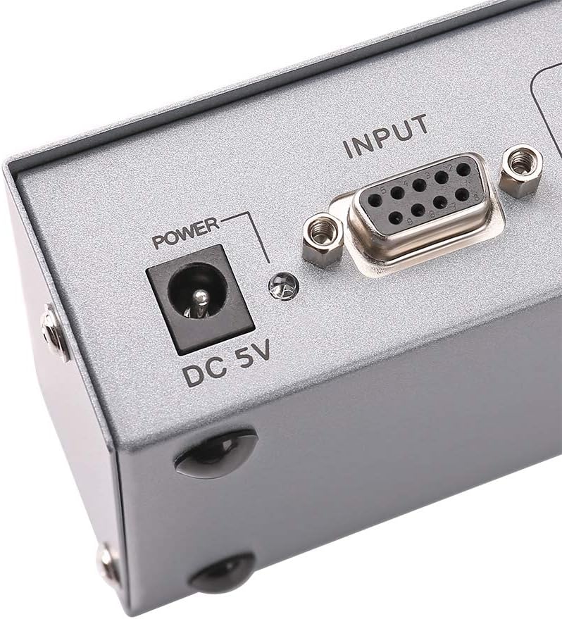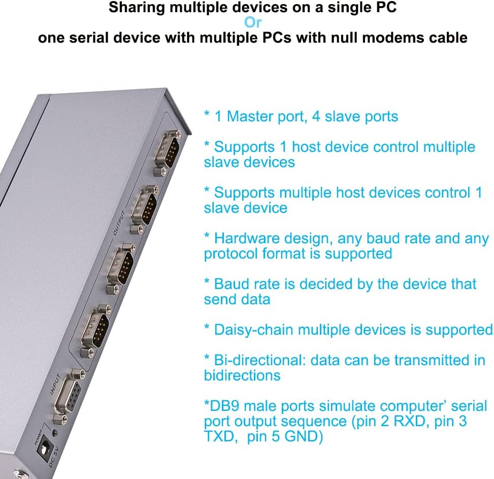 4 way serial port divider is a cost effective solution when you need to manage and control multiple DB9 RS232 devices (monitor, printer, modem, scales, scanner) via computer. Connection 1: Monitor and Control Multiple Terminal Device via 1 PC 1 PC connected to input port, and 4 devices to output ports via Straight Through serial cable separately (functioned as RS232 divider: 1 master controls 4 slave). Serial port combiner splits 1 port in multi hardware COM ports that are used by several applications, so the applications can receive the same data from PC at once (duplicator). Connection 2: Capture Data from 1 Terminal Device on Redundant PCs 4 PCs connected to output port, 1 data acquisition equipment to input port via Null Modem serial cable separately. (functioned as RS-232 switch: 4 masters control 1 slave) Several PCs receive data from 1 device, sharing multiple PCs on a single peripheral; only 1 terminal device can send data to a laptop at a time. RS232 hub splitter auto-outputs the values as long as it’s wired and powered. DC 5V 1A power adapter provides stable power to transmit and receive data without any delay; ±8kV ESD electrostatic discharge protection: 3 Wire RS 232 Connection: TxD, RxD, GND For IT Administrators to add legacy functionality to notebook, desktop PC, modem and server without COM port Monitor and control industrial / automotive sensors equipment, barcode scanner, scale, radio, personal weather station, GPS, POS, scanner, receipt printer, satellite receiver, modem, PDA with serial sync Serial adapter hub connect and program LED Digital signage board ... Master bus: 1x DB9 female (pin2-TxD, pin3-RxD, pin5-GND) Slave bus: 4 x DB9 male (2-RxD, 3-TxD, 5-GND) Input/Output Level: RS232-C Cascade: Yes What’s Included: 1x External Serial Splitter Box 1x Power Supply Adaptor 1x Manual