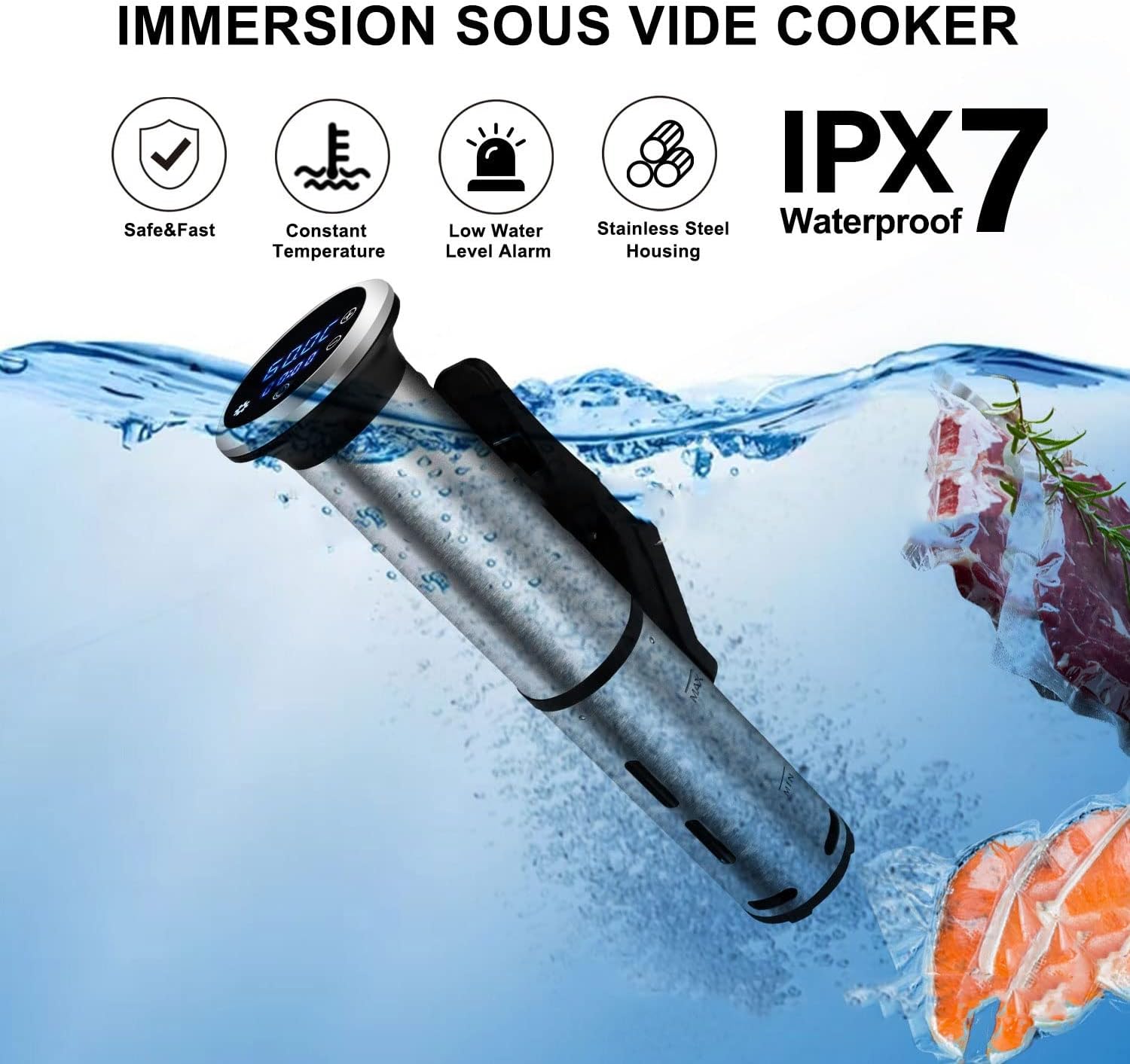 Perfect Doneness and Accurate Timer- Digital control panel makes the temperature accurate to 0.1℃ and time to minutes. Wide range of temperature (Max 95℃/203°F) and time control (Max 99h 59mins) allows you to cook any type of food you like.Sous vide cooking maximally prevents essential juices and amplifies flavor.Easy to use and clean -Simply attach the cooker to any pot, add water, placed your ingredients in a vacuum sealed bag or glass jar. Start cooking with the touch of a button on the device. The sous vide cooker's timer and temperature control allow you to step away and relax while your food cooks perfectly. No additional equipment needed.The sous vide cooker's detachable stainless steel skirt and disks are dishwasher safe making this kitchen appliance easy to clean and maintain.3D Circulation Heating Tech: The Cooker's generates a powerful 360 water circulation,3D heating evenly distributes heat energy and constant temperature cooking.The temperature setting available with both in Celsius (℃)or Fahrenheit (℉)displayRecipes advice:Steak-132°F/55.5°C, 6 hoursSalmon-110°F/43°C, 30-45 minutesChicken-140°F/60°C, 30 minutesEggs-140°F/60°C, 10 minutesProduct specificationVoltage: 220V-240V or 110V US regulationsPower: 1200WWeight: 1.6kgHow to Use:Sous Vide circulator requires a 6-15L round,rectangular or other different container or pot.Firmly lock the product by clamping it on the side of your container.