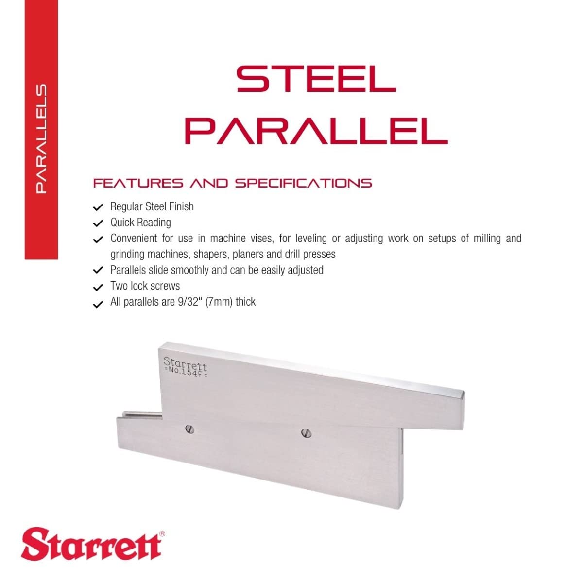The Starrett Steel Adjustable Parallel is produced with quality materials. It provides a wide range of use in layout, gaging, inspection work and for setups on various machine tools. Their adjustable feature makes it possible to adjust them to exact size by micrometer measurement and also permits use in place of several solid-type parallels. These parallels are useful as gages in checking the size of slots and openings. They are also convenient for use in machine vises, for leveling or adjusting work on setups of milling and grinding machines, shapers, planers, drill presses and for many other applications. Parallels slide smoothly and can be easily adjusted. The smaller sizes A, B, and C, are locked by one screw while the larger sizes, D, E, and F, have two lock screws. Starrett Parallels help an end user directly measure, layout, fixture, and do other support work related to linear dimensioning to accomplish a job. It is made with the same care and accuracy as our precision rules. Incorporating convenience and excellence, Starrett tools are designed to be user-friendly. Whether you're an experienced professional or an amateur when it comes to home improvement, our tools are handy and accessible. Starrett has set the standard for precision, quality, and innovation, our products are long-lasting and robust with excellent service and performance. Manufacturing long-lasting and easy to use tools that provide consistent and reliable performance since 1880, Starrett tools are made with the highest standard of quality and workmanship, manufacturing more than 5,000 various tools, gages, and instruments, providing fine precision tools for industrial, professional, and consumer markets worldwide.