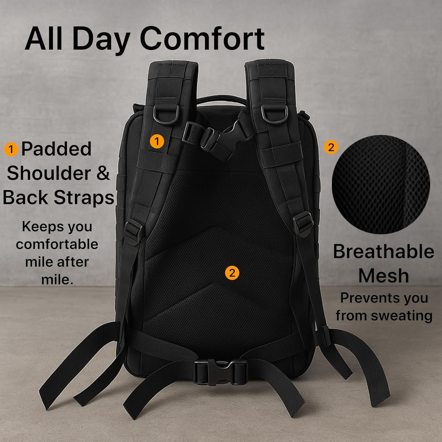Built for reliability in the toughest conditions, this 30L Tactical Backpack is designed to handle everything from daily commutes to 3-day outdoor missions. Engineered with durability and organization in mind, it features a MOLLE-compatible exterior, a dedicated 17” laptop compartment, and multiple compartments for maximum gear storage. This tactical pack offers a hydration-compatible system (hydration bladder not included), making it ideal for hiking, camping, travel, or emergency preparedness. Adjustable and padded shoulder and back straps provide long-lasting comfort, while side load compression straps help stabilize heavy loads and maintain a compact profile. Whether you’re heading into the backcountry or navigating urban environments, this backpack delivers professional-grade utility and comfort in one compact design. Key Features: MOLLE SYSTEM: Reinforced webbing throughout for modular attachments, making it easy to customize with pouches or tactical gear. LAPTOP COMPARTMENT: Interior padded sleeve fits laptops up to 17 inches, keeping your tech secure while on the move. COMFORTABLE & SUPPORTIVE: Features padded shoulder and back straps with full adjustability for ergonomic carrying during extended use. HYDRATION COMPATIBLE: Designed to accommodate a hydration bladder for on-the-go hydration (hydration bladder not included). SMART STORAGE LAYOUT: Exterior: 2 main zipper compartments, 2 front zipper compartments, 1 back pocket for concealed carry or flat items. Interior: 1 padded laptop pocket, 1 mesh zipper pocket, 1 mesh open pocket, 6 open utility pockets, 2 small mesh open pockets for quick-access gear. DIMENSIONS: 11" W x 18.1" H x 9.5" D — perfect as a 3-day assault pack, bug out bag, or travel backpack. This tactical backpack blends rugged design with modern functionality — built for mission-ready performance, whether you're off the grid or on your daily grind.