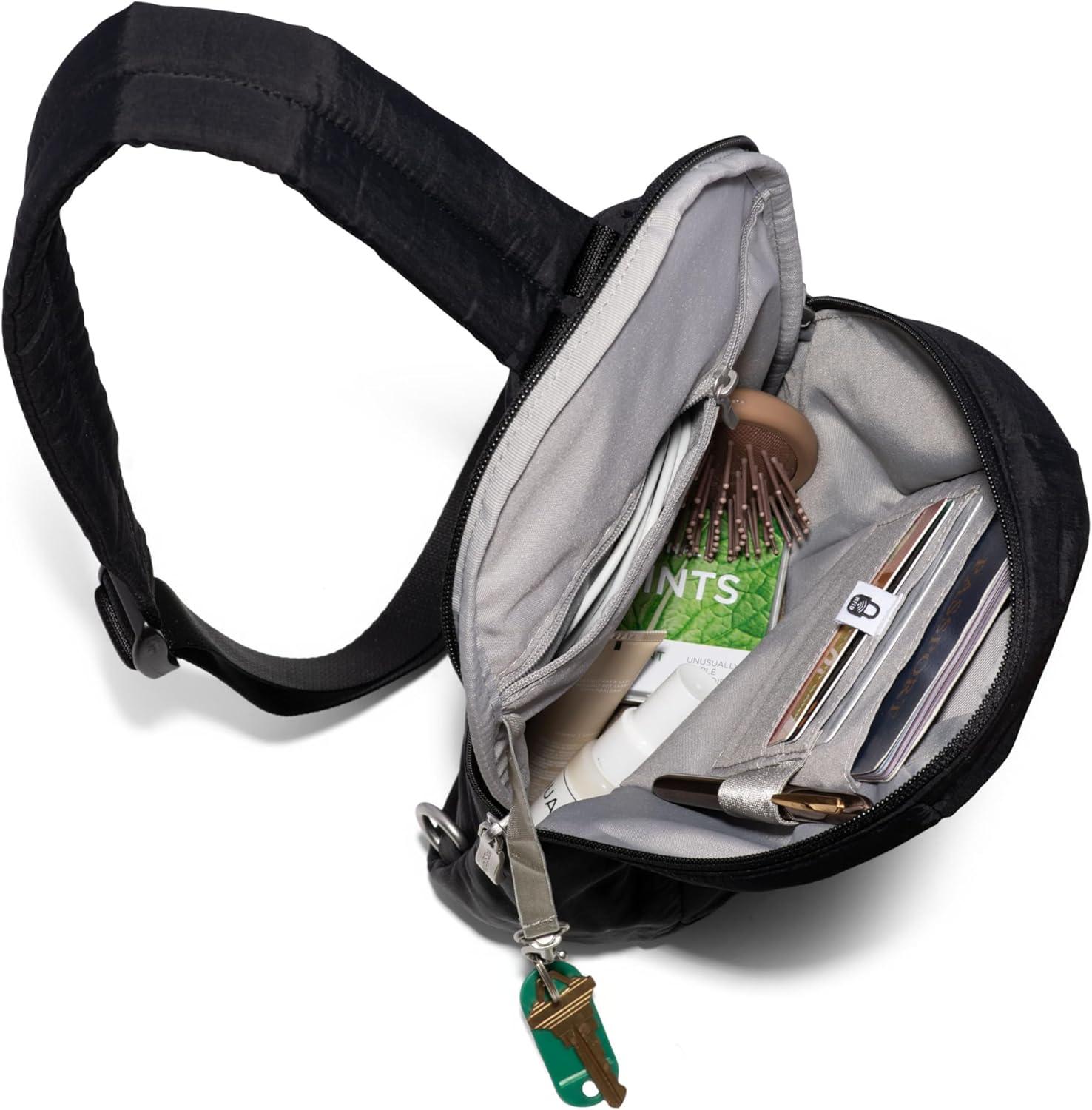 Made for movement, the Swift Sling keeps up without weighing you down. Crafted in ultra-light B-Lite material, it’s minimal by design but packed with thoughtful details—like RFID-protected card slots, a built-in key leash, and an adjustable strap that switches sides for all-day comfort. Whether you're commuting, traveling, or out on the weekend, this streamlined essential keeps your must-haves close and your hands free. It’s ready for wherever the road takes you. Designed for everyday movement and travel convenience, this lightweight sling bag delivers hands-free comfort, smart organization, and modern security in a sleek, compact design. Ideal for commuting, sightseeing, walking, and daily errands, this crossbody sling for women and men keeps cruise essentials organized without added bulk. The exterior measures 7.25" W x 12.5" H x 3.5" D with a 4.4 liter capacity and an ultra-lightweight 7.8 oz construction, making it a comfortable everyday sling backpack or travel sling bag for all-day wear. Crafted from lightweight recycled nylon, this sling offers durability and flexibility while remaining easy to carry. A padded sling strap adjusts from 20" to 44" and can be worn on the right or left side, allowing a customized fit for walking, commuting, or travel. Designed as a secure RFID travel sling, it includes three RFID-protected card slots to help protect credit cards and ID from unauthorized scanning during daily use and travel. Thoughtful interior organization features an interior slip pocket that fits a phone, a privacy pocket for valuables, a key leash, and a penholder, keeping everything accessible and easy to find. For added convenience, a back slip grab-and-go phone pocket allows quick access to your device while on the move. A built-in loop to hang from a hook makes this sling easy to store at home, work, the gym, or a hotel. Perfect as a lightweight travel sling bag, crossbody sling backpack, everyday commuter sling, or hands-free walking bag, this versatile design supports an active lifestyle with comfort, organization, and security wherever the day takes you.